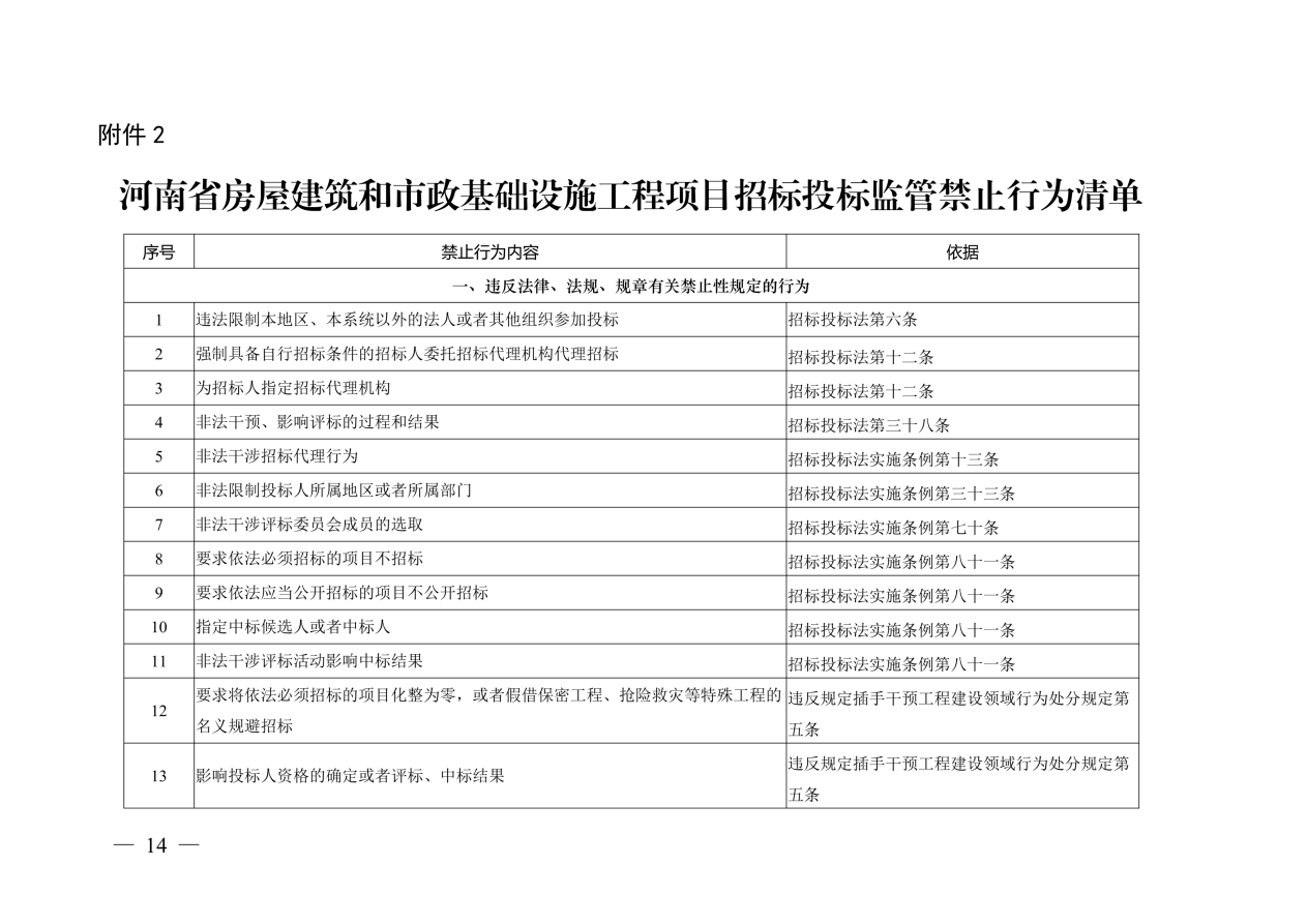 一、各地住房城鄉(xiāng)建設部門要嚴格依法履行房屋建筑和市政基礎設施工程項目招標投標監(jiān)管職責。要按照《河南省房屋建筑和市政基礎設施工程項目招標投標活動禁止行為清單》(附件1),對參與招標投標活動的各方市場主體加強監(jiān)管,加大違法違規(guī)行為打擊力度。嚴禁國家工作人員以任何方式非法干涉招標投標活動。國家工作人員在履行招標投標監(jiān)管職責時的禁止行為以清單方式(附件2)列明,并向社會公布。