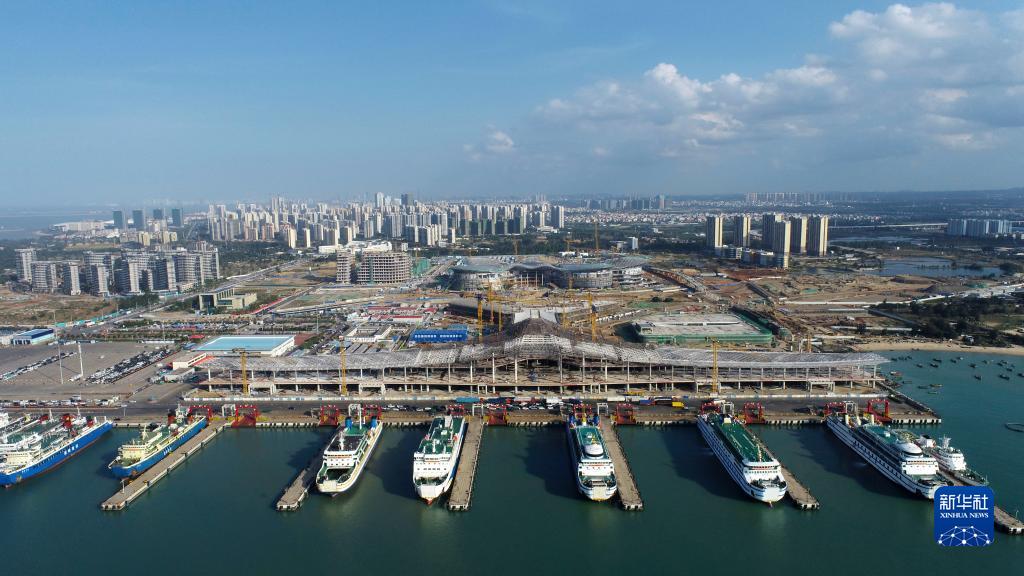 這是2022年2月11日拍攝的??谛潞8劭瓦\綜合樞紐項目施工現(xiàn)場(無人機照片)。新華社發(fā)(黎多江 攝)