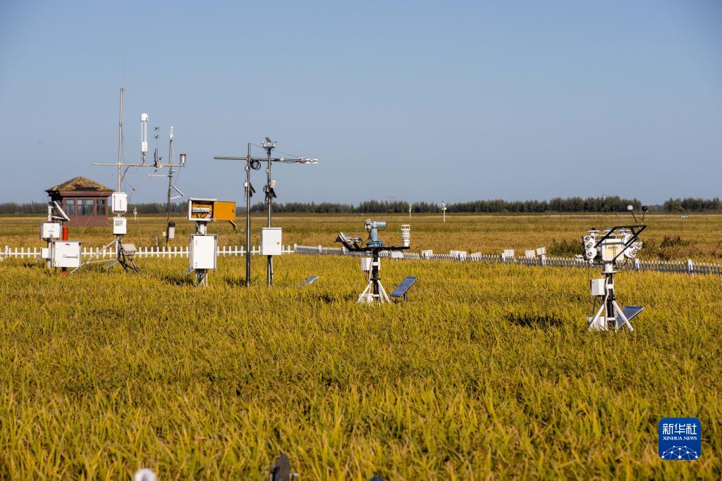 這是黑龍江省富錦市萬(wàn)畝水稻科技示范園內(nèi)的氣象監(jiān)測(cè)設(shè)備(2022年9月2日攝)。新華社記者 張濤 攝