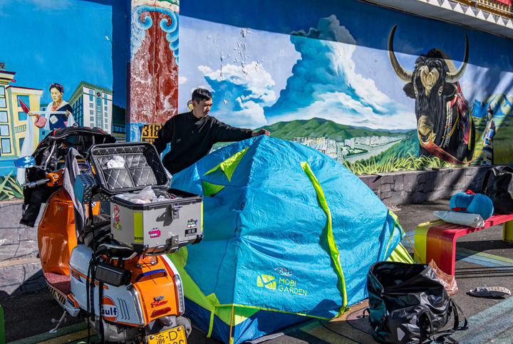 ??經(jīng)國道318線前往西藏旅游的重慶游客張靜在芒康縣如美鎮(zhèn)拉烏村整理帳篷(2023年10月20日攝)。新華社記者 孫非 攝
